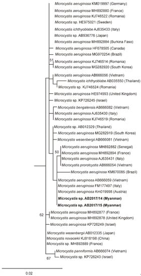 Only limited information is available about the limnological characteristics of Meiktila Lake and other freshwater habitats in Myanmar. In 1995, a study of the algal flora of Meiktila Lake was reported [4]. A recent study described the investigation of physical parameters, macrophyte and phytoplankton composition in the period 2011–2014 in Meiktila Lake [5]. Twenty taxa of aquatic macrophytes including helophytes have been documented in Meiktila Lake [5]. Several heterocytous cyanobacterial taxa, e.g., Anabaena, Anabaenopsis and Calothrix and a few nonheterocytous cyanobacterial taxa e.g., Aphanocapsa, Chroococcus, Microcystis, Arthrospira and Oscillatoria have been reported but not further investigated [4,5]. Neither study mentioned the presence of the cyanobacterium Raphidiopsis raciborskii (formerly Cylindrospermopsis raciborskii) (Woloszynska) Aguilera, Berrendero Gómez, Kastovsky, Echenique & Salerno nor the presence of the microcystin (MC) and cylindropsermopsin (CYN) groups of cyanobacterial toxins, which are documented from many lakes in Asia [8,9,10].