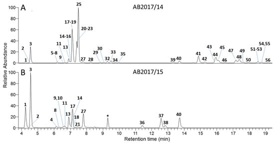 LC–HRMS full scan extracted ion chromatograms (3.8–19.4 min, positive ionization mode) of extracts from (A) Microcystis culture AB2017/14 and (B) Microcystis culture AB2017/15. Chromatograms were produced by extracting at m/z (± 5 ppm) for all MCs listed in Table 4 (see Table S1 for positive ionisation m/z values). Note that some of the smaller peaks are not labelled on the chromatograms, and the peak marked with an asterisk is not from a MC.
