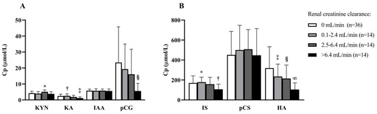 - Meijers, B.K.; De Loor, H.; Bammens, B.; Verbeke, K.; Vanrenterghem, Y.; Evenepoel, P. p-Cresyl sulfate and indoxyl sulfate in hemodialysis patients. Clin. J. Am. Soc Nephrol. 2009, 4, 1932–1938. [Google Scholar] [CrossRef]