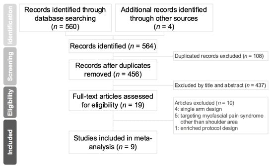 The initial search of the databases yielded 564 studies. After excluding 108 duplicated articles and 439 non-relevant articles by screening titles and abstracts, 19 studies were deemed eligible for subsequent evaluation. Ten were further excluded because four lacked a control group [10,13,14,15], five targeted myofascial pain in regions other than shoulder areas [16,17,18,19,20], and one used an enriched protocol design to assess the effect of repeated BoNT injections [14] (Figure 1).