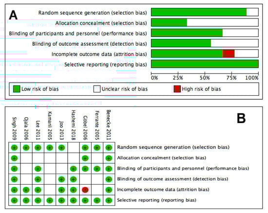 The methodological quality of the enrolled studies was assessed using the Cochrane Risk of Bias Tool for RCTs [55]. The risk of bias was classified as either high, low, or unclear. The quality assessment was based on the following aspects: sequence generation (selection bias), allocation concealment (selection bias), blinding of patients and personnel (performance bias), blinding of outcome assessment (detection bias), incomplete outcome data (attrition bias), and selective outcome reporting (reporting bias). Any discrepancy in opinions of assessments between the two evaluators were solved either through discussion or by the judgment of the corresponding author.