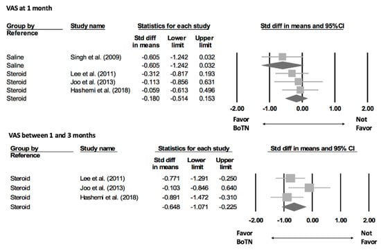 Regarding the visual analogue scale (VAS) at one month after intervention, only one trial compared BoNT injections with saline [27]; the standardized mean difference (SMD) was −0.605 (95% CI, −1.242 to 0.032) (Figure 3). The other three trials used corticosteroid injections as comparisons and their summarized SMD was −0.180 (95% CI, −0.514 to 0.153; I square < 0.001) [23,24,25]. None of the aforementioned effect sizes reached statistical significance. In terms of VAS between one and three months after intervention, only the studies comparing corticosteroid injections had available data. The pooled SMD was −0.648 (95% CI, −0.1071 to −0.225), indicating a significantly superior outcome of BoNT than corticosteroids.