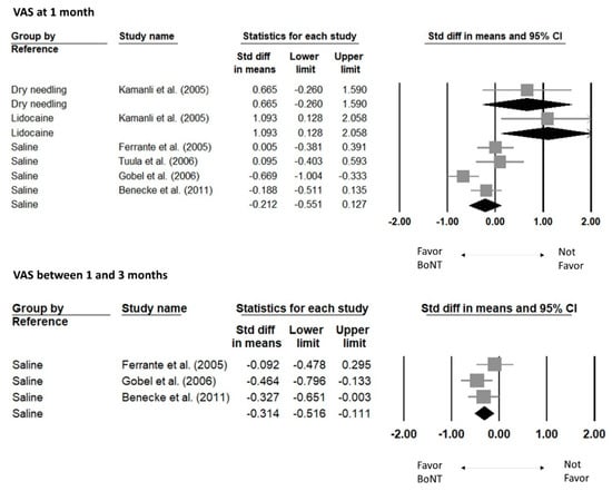 The change in the VAS of pain before and after treatment was treated as the primary outcome. The VAS was extracted at or closest to the following points: baseline, within one month and between one to three months after the intervention. The summarized SMD of the VAS changes between two treatment arms was used to compare the effectiveness of BoNT injections with other injectates or approaches [56].