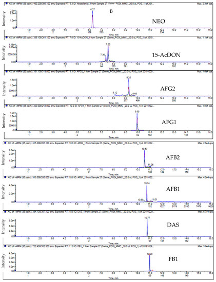 - Desmarchelier, A.; Tessiot, S.; Bessaire, T.; Racault, L.; Fiorese, E.; Urbani, A.; Chan, W.-C.; Cheng, P.; Mottier, P. Combining the quick, easy, cheap, effective, rugged and safe approach and clean-up by immunoaffinity column for the analysis of 15 mycotoxins by isotope dilution liquid chromatography tandem mass spectrometry. J. Chromatogr. A 2014, 1337, 75–84. [Google Scholar] [CrossRef]