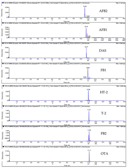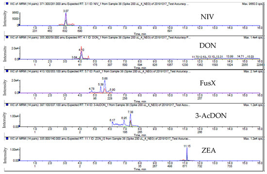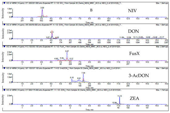 - Varga, E.; Glauner, T.; Köppen, R.; Mayer, K.; Sulyok, M.; Schuhmacher, R.; Krska, R.; Berthiller, F. Stable isotope dilution assay for the accurate determination of mycotoxins in maize by UHPLC-MS/MS. Anal. Bioanal. Chem. 2012, 402, 2675–2686. [Google Scholar] [CrossRef]