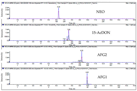 - Malachová, A.; Sulyok, M.; Beltran, E.; Berthiller, F.; Krska, R. Optimization and validation of a quantitative liquid chromatography–tandem mass spectrometric method covering 295 bacterial and fungal metabolites including all regulated mycotoxins in four model food matrices. J. Chromatogr. A 2014, 1362, 145–156. [Google Scholar] [CrossRef]