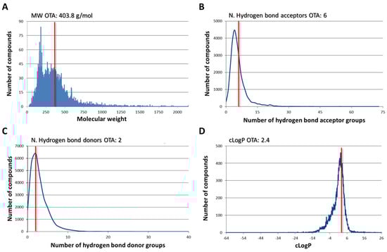 Description of chemical space represented in the ligands database in terms of (A) molecular weight (MW), (B) number (N) of hydrogen bond acceptor groups, (C) number (N) of hydrogen bond donor groups, and (D) calculated LogP (cLogP). Red lines highlight the position of Ochratoxin A (OTA).