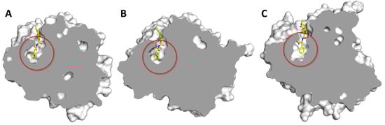 Graphical representation of OTA in complex with carboxypeptidase B (CPB) (A), carboxypeptidase A (CPA) (B), and carboxypeptidase T (CPT) (C). Proteins are represented in gray cut surface while OTA is represented in yellow sticks. The red ring indicates the position of the buried cleft receiving the Phe moiety of OTA.