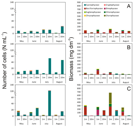 In ŁL, Bacillariophyceae dominated in biomass in each month as well as depth, constituting about 60% of the total biomass. Biomass of the other groups was clearly lower (Figure 1A). In RL, Bacillariophyceae also dominated in biomass, constituting 42% of the total biomass of the phytoplankton assemblage and the largest share of this class was recorded from May to July at a depth of 1 m. It was also found that Chlorophyceae, Dinophyceae, and Cyanophyceae amounted to 20%, 13%, and 13% of the total biomass, respectively (Figure 1B). Bacillariophyceae also dominated in ŻL (38% of the total biomass). Furthermore, ŻL had a significant share of the Chlorophyceae (12%) and Charophyceae (21%) at a depth of 1 m (Figure 1CSurprisingly, Dinophyceae dominated in biomass in June at a depth of 1 m (56%), and of Cyanophyceae in July at a depth of 10 m (87% of biomass).