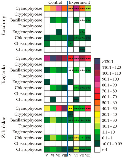 Our study showed that the Synechococcus sp. exudates had a statistically significant effect on the number of Cyanophyceae cells in ŁL (Figure 2). It was shown that in May and June the Cyanophyceae cell number increased by 200% (ANOVA, p < 0.001) and 240% (p < 0.001), respectively, in relation to the control treatment. In the following months, the number of Cyanophyceae cells was significantly inhibited and amounted to 60% in July (p < 0.001) and 30% in August (p < 0.001), compared to the control samples. Similarly, the number of Bacillariophyceae cells was inhibited in June and July and stimulated in the last studied month, i.e., in August. The cell number of Bacillariophyceae in June was 55% (p < 0.001) relative to the control. It is worth noting that in July, Bacillariophyceae were completely eliminated in the experimental sample, while present in the control sample. In August, however, 150% (p < 0.001) stimulation of Bacillariophyceae growth relative to the control conditions was noted. It was shown that the exudates obtained from the Synechococcus sp. significantly stimulated the abundance of Euglenophyceae in July in ŁL, which was 230% (p < 0.001) compared to the control. In the same month, a small amount of Charophyceae was also noted in the experimental sample, which were not recorded in the control sample. In turn, the exudates from picocyanobacterium negatively affected organisms belonging to the Chrysophyceae, whose number in May was 70% (p < 0.05) compared to the control, and the number of Chlorophyceae, whose number was 75% in June (p < 0.001), 60% (p < 0.001) in July, and only 5% (p < 0.001) in August.