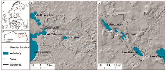 Localization of the studied lakes in Masurian Lakeland, north-eastern Poland. (A) Poland in Europe; (B) the Masurian Lakeland in Poland; (C) the watershed of LŻ; and (D) the watersheds of LŁ and LR.