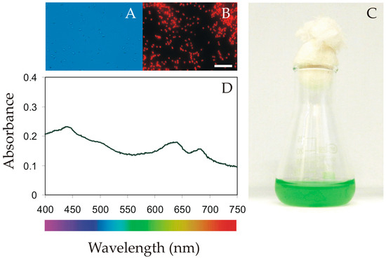 Light (A) and epifluorescence (B) microscope photographs of picocyanobacteria strain CCBA AR-258 (scale = 10 µm); photographs of the picocyanobacterial culture in 100 mL glass flasks from the experimental phase (C); and PAR absorption spectra determined for this strain at an optical density (OD750) = 0.1 (D).