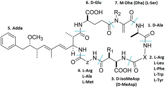 General structure of hepatotoxic cyclic peptides, microcystins. 1–7 signify seven amino acid residues. X and Z in positions two and four are highly variable L-amino acids (reproduced from [35], 2019, MDPI).