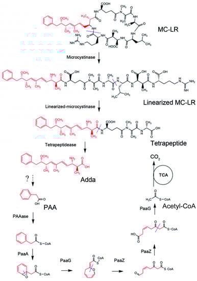 Regarding the sequential enzymatic hydrolyses of peptide bonds, mlrC gene was found not only to act on the tetrapeptide but is also capable to hydrolyze linearized MC-LR without earlier processing by mlrB gene [114,136]. Sphingopxyis sp. USTB-05 showed complete MCs (MC-LR, MC-RR and MC-YR) degradation with different intermediate products [30,118,119,120,121]. These findings suggest that the enzymatic processes and degradation pathways may vary between MC variants and bacteria strains. Further aside the known MC-LR degradation products (linearized MC-LR, tetrapeptide and Adda), Ding et al. [116] identified eight new different intermediate degradation products namely, three tripeptides (Adda-Glu-Mdha, Glu-Mdha-Ala, and Leu-MeAsp-Arg), three dipeptides (Glu-Mdha, Mdha-Ala, and MeAsp-Arg) and two amino acids (Leu, and Arg) using Sphingopxyis sp. m6. These findings also suggest that more than three intermediate products are capable to occur during MC degradation. In a recent study Yang et al. [123] found a potential link between paa gene clusters for phenylacetic acid (PAA) degradation in the neighborhoods of mlrABCD gene cluster. Interestingly complete MC-LR degradation by Sphingopyxis sp. YF1 without Adda as the final degradation product (as illustrated in Figure 2.) was noted. MC-LR was sequentially degraded into linearized MC-LR, tetrapeptide and Adda. The Adda was further degraded into PAA, and was converted into PAA-CoA by PAAase. Subsequently PAA-CoA was degraded to acetyl coenzyme A (acetyl-CoA) by PaaA, PaaG and PaaZ homologues. Finally, acetyl-CoA was completely converted to CO2 through tricarboxylic acid (TCA) cycle [123]. The evidence suggests that PAA may be the downstream metabolism path of MC degradation. However, further study needs to determine the kind of enzyme that degraded Adda into PAA.