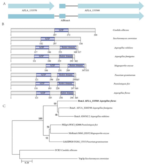 Since A. nidulans RsmA was a suppressor of a secondary metabolism mutant (i.e., laeA) through the activation of gene expression by binding to Yap-like sites [22,23], its ortholog in A. flavus could also regulate secondary metabolism. By searching the A. flavus whole genome using the RsmA amino acid sequence of A. nidulans as a query, a gene AFLA_133560 was identified with the highest identity to RsmA (65%). NCBI data showed that the AFLA_133560 ORF, consisting of 660 bp with an intron (102 bp), encodes a putative bZIP protein of 185 amino acids (aa). However, compared with the reported RsmA homologs in fungi, the length of the protein encoded by the AFLA_133560 gene is shorter. To identify the encoding sequence of the RsmA ortholog gene accurately, the ORF and cDNA were both amplified and sequenced, and the sequence was then analyzed using the DNAMAN 7.0 software (Lynnon Biosoft, San Ramon, CA, USA ) and SoftBerry software (Softberry, Inc., Mount Kisco, NY, USA) [35]. We found that rsmA ortholog gene in A. flavus is from the start codon of AFLA_133570 to the stop codon of AFLA_133560, consists of 1070 bp with two introns (47 and 102 bp), and encodes a 305 aa protein, henceforth called AflRsmA (Figure 1A). Besides the most conserved bZIP domain in all reported RsmA homologs, the redox domain was the conserved domain of AflRsmA in comparison with A. nidulans RsmA, A. fumigatus RsmA, M. oryzae MoRsmA, and F. graminearum GzbZIP020 (Figure 1B). Based on the bZIP domain sequences, a phylogenetic analysis with functionally characterized RsmA indicated that AflRsmA is more closely related to the RsmA in A. nidulans and A. fumigatus (Figure 1C).