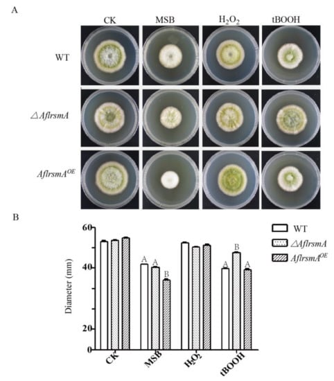 To investigate the tolerance of A. flavus stress to oxidant stress, the correct mutant strains were inoculated on YGT media containing oxidant reagents. Without oxidative stress, there was no difference in the colony diameters of WT, ΔAflrsmA and AflrsmAOE strains (Figure 3). Growth assays on YGT supplemented with various oxidative reagents demonstrated that ΔAflrsmA strain was less sensitive to tBOOH, but AflRsmAOE strain was more sensitive to MSB, as determined by the diameter measurement (Figure 3). However, there is no difference in colony diameter among WT, ΔAflrsmA and AflrsmAOE strains with H2O2 treatment (Figure 3). Taken together, AflRsmA is critical for the response of A. flavus to oxidative stress, but the regulation mechanism is dependent on the oxidant reagent.