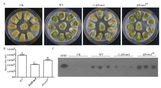 Effect of AflrsmA on A. flavus Pathogenicity. (A) Growth of fungal colonies on living corn after five days of inoculation. (B) Spore production on corn after five days of inoculation. Data were analyzed using the GraphPad Instat software package version 5.01 (Graph Pad software Inc., San Diego, CA, USA) according to the Tukey–Kramer multiple comparison test at p < 0.05. The letter indicates statistical significance at p < 0.05. (C) Thin layer chromatography analysis of aflatoxin B1 extracted from host plant corn. AFB1 = aflatoxin B1 standard.