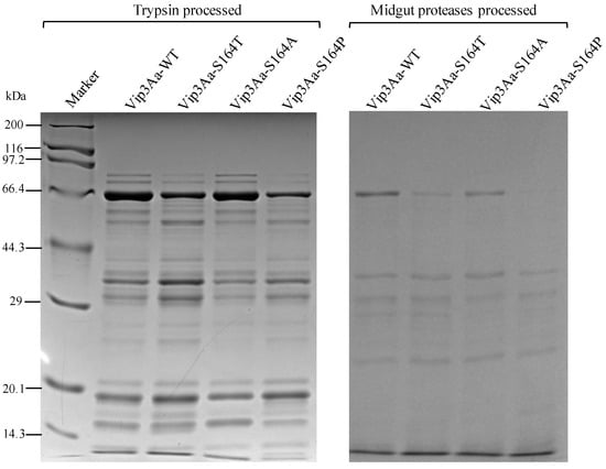 Analysis of Vip3Aa proteins after treatment by trypsin or midgut proteases of S. litura. Purified Vip3Aa-WT, Vip3Aa-S164T, Vip3Aa-S164A and Vip3Aa-S164P were in vitro digested by commercial trypsin or midgut proteases of S. litura. Processed proteins were mixed with 5 × SDS-PAGE sample buffer followed by heat denaturation and analyzed by the electrophoretic analysis in an SDS-PAGE gel.