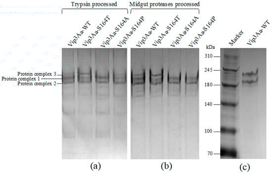 Analysis of native Vip3Aa proteins after proteolytic processing. Protease treated Vip3Aa-WT, Vip3Aa-S164T, Vip3Aa-S164A and Vip3Aa-S164P by either commercial trypsin or midgut proteases of S. litura larvae were analyzed by the electrophoretic analysis without heat denaturation. (a) Vip3Aa proteins after tryptic processing were analyzed in a native gel; (b): Vip3Aa proteins after processing by midgut proteases were analyzed in a native gel; (c): Vip3Aa proteins after tryptic processing were mixed with 5 × SDS-PAGE sample buffer without β-mercaptoethanol and analyzed in an SDS-PAGE gel. Protein complex 1, protein complex 2 and protein complex 3 in panel (a) indicate gel bands sliced from each lane in the native gel.