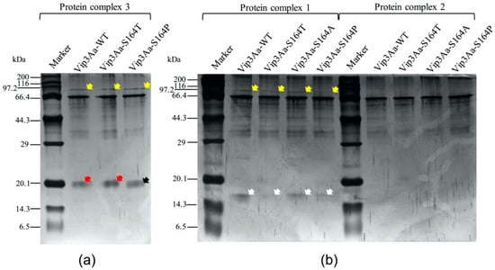 To analyze the compositions of the three protein complexes, the bands corresponding to protein complexes 1, 2 and 3 (Figure 2a) were excised from the native PAGE gel (Figure 2a). The gel slices were mixed with SDS-PAGE sample buffer, heat denatured and loaded on SDS-PAGE gel to separate the proteins. All protein complexes contained the 65 kDa major fragment and multiple weak bands from 29 kDa to 66.4 kDa (Figure 3). Difference in composition was observed between the wild type and the mutants in the fragments below 20 kDa. A 19 kDa fragment was observed from protein complex 3 of trypsin-processed Vip3Aa-WT and Vip3Aa-S164T (Figure 3a). In comparison with the 19 kDa fragment, a slightly smaller fragment (17 kDa) was observed from the protein complex 3 from Vip3Aa-S164P (Figure 3a). An even smaller 15 kDa fragment was observed from protein complex 1 of Vip3Aa-WT and three mutants (Figure 3b). No protein bands below 20 kDa were observed from the protein complex 2 (Figure 3b). In addition, a peptide showing molecular weight around 95 kDa was observed from the protein complex 1 and 3 but not from the protein complex 2 (Figure 3).