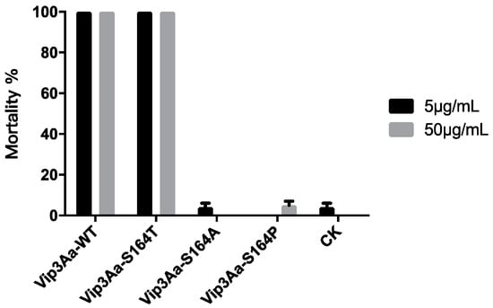 Trypsin-processed Vip3Aa-WT, Vip3Aa-S164T, Vip3Aa-S164A and Vip3Aa-S164P were fed to the neonates of S. litura, respectively, to assay their insecticidal activity. After 96 h, 100% mortality was observed by feeding S. litura larvae with 5 μg/mL and 50 μg/mL of trypsin-processed Vip3Aa-WT or Vip3Aa-S164T. In contrast, neither trypsin-processed Vip3Aa-S164A nor Vip3Aa-S164P showed significant toxicity to the larvae of S. litura (Figure 5). The insecticidal activity of trypsin treated Vip3Aa proteins was consistent to that of Vip3Aa protoxins (Table 1) and correlated with the formation of the protein complex 3 composed of the 19 kDa and the 65 kDa peptides (Figure 2a and Figure 3a)