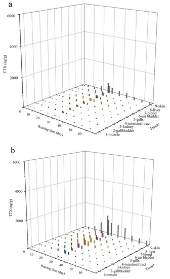 In 2016, China allowed certified companies to cultivate pufferfish T. rubripes and T. obscurus. The accumulation and elimination patterns of TTX in T. rubripes have been extensively studied [19]. TTX mainly accumulated in the skin, liver, and ovary [20], but there were important differences according to the age group: TTX accumulated mainly in the liver in adult fish, whereas in juvenile fish the maximum was found in the skin [19,26,27]. Study on the accumulation, elimination, and distribution of TTX in T. obscurus has not been reported, yet the related information is essential to prevent and control the occurrence of TTX poisoning.
