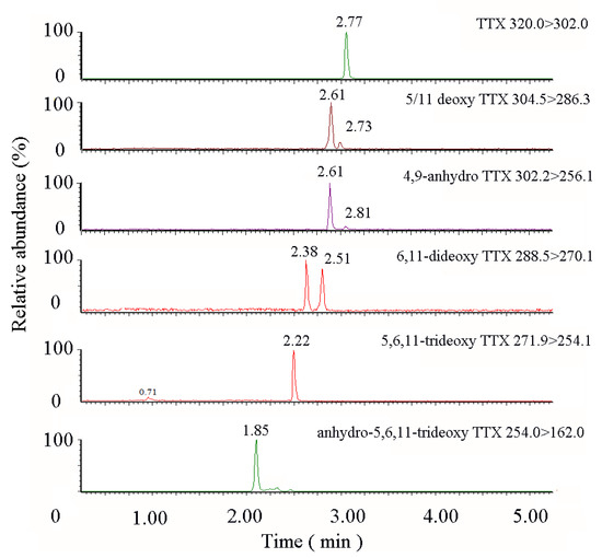 The mass spectrometry parameters were as follows: electrospray ion source, positive ion (ESI+); mode, multiple reactions monitoring (MRM); capillary voltage, 3.0 kV; ion source temperature, 110 °C; desolventizing gas temperature, 350 °C; cone gas flow rate, 50 L/h; and desolventizing gas flow rate, 600 L/h. Data acquisition was conducted in MRM mode, and related parameters for TTX and its analogs are shown in Table 4.