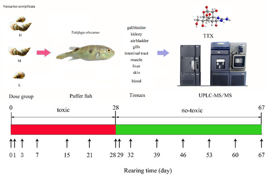 Diagram of the TTX accumulation and elimination experiment. The fish was fed with toxic feed until the 28th day, then fed with non-toxic feed until 67th day.