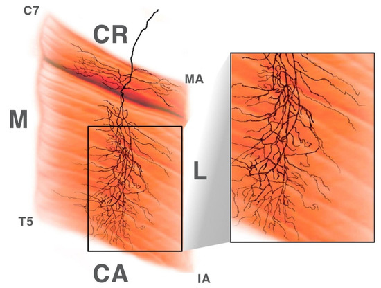 Schematic view of the right side of the rhomboid muscle and intramuscular nerve distribution. (C7: spinous process of C7, T5: spinous process of T5, MA: medial angle, IA: inferior angle, M: medial, L: lateral, CR: cranial, CA: caudal).