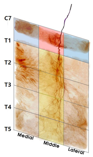 According to the dissection and modified Sihler staining method, 18 of the 30 rhomboid minor muscles had two regions in which the arborization patterns were the largest: the medial section of C7− T1 and the lateral section of C7−T1. Additionally, 10 had the largest arborization patterns in the medial section of C7−T1 and middle section of C7−T1. The remaining two specimens appeared to have the largest arborization patterns in the middle and lateral section of C7 to T1. A schematic image of an intramuscular arborization pattern is shown in Figure 1.