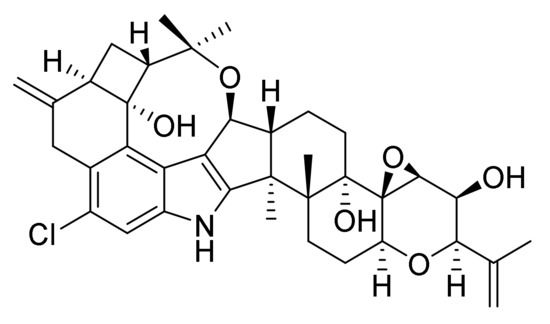 Penitrem A is a decacyclic indole–diterpenoid derived from the biosynthetic intermediate paspaline in a multi-step reaction pathway (Figure 1). The penitrem A molecule contains a fused cyclohexyl-cyclobutyl ring that is formed by two cyclized isoprene units attached to a tryptophan-derived indole moiety [6,9]. Functional groups include hydroxyl groups, chlorine and an epoxide ring.