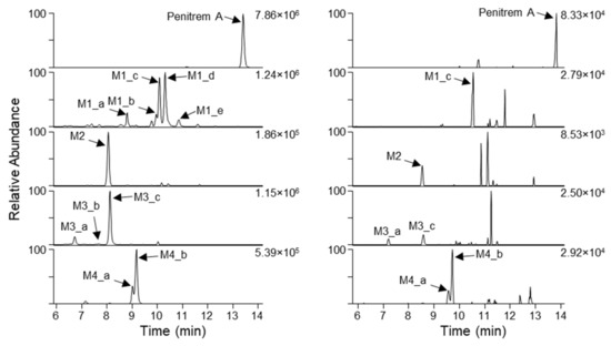 Previously, up to five different hepatic penitrem A metabolites were observed either in vitro in incubations with rat liver microsomes or primary rat hepatocytes, or in vivo in mice after oral administration [27,28]. The samples were analyzed by low-resolution MS that did not allow the calculation of elemental compositions. However, the mass differences between penitrem A and the observed putative hepatic metabolites in the rodent experiments were comparable to those observed for the dog liver microsomes in the present study, except for a putative oxidation/dehydration product that was only detected in the livers of exposed mice and observed with a mass difference of −2 m/z relative to penitrem A. The increased number of identified metabolites in our study could also arise from a notable difference in the chromatographic analysis. While the previously reported HPLC methods used more traditional separation columns that probably did not have the ability to separate different isomers, we used a UHPLC method that was optimized for improved chromatographic resolution (longer column, smaller particles, core-shell instead of fully porous material). It could therefore be possible that penitrem A was also metabolized into isomeric metabolites in the rodent models, but that the analytical methodologies were insufficient to determine these.