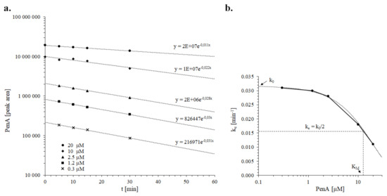 (a) Regression analysis for the determination of ke at different penitrem A initial assay concentrations. (b) Approximation of KM for penitrem A in incubations with dog liver microsomes. Regression of the concentration versus ke curve allows convergence towards k0 at infinitesimally low substrate concentrations. The penitrem A concentration corresponding to k0/2 is equivalent to KM.