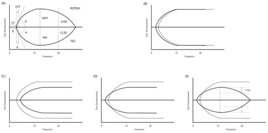 Schematic examples of thromboelastography (TEG). (A) Typical waveform of TEG. Terms in the upper wave are used in ROTEM and terms in lower wave are used in TEG. (B) Procoagulant effect with decreased delay of coagulation initiation and preservation of clot strength. (C) Anticoagulant effect with increased delay of coagulation initiation and decreased clot strength, (D) Pseudoprocoagulant effect with decreased delay of coagulation initiation and decreased clot strength, (E) Fibrinolysis effect with a delayed decrease in the clot strength by >15%. The dotted line indicates the normal presentation. CT, coagulation time, CTF, clot formation time, MCF, maximal clot firmness, α, slope between CT and CFT, LY30 or R and K, lysis after 30 min, R, time of latency to initial fibrin formation, K, time to get amplitude of 20 mm, MA, maximal amplitude, CL30, clot lysis after 30 min.