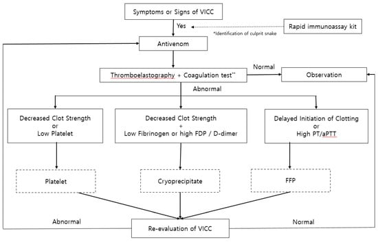 Further explanations for the proposed treatment algorithm in VICC due to a pit viper bite (Figure 2) will now be described. Adding TEG to traditional coagulation tests can lead to early detection of VICC. Identification of venom and subsequent administration of monospecific antivenom is the most effective and desirable treatment. Performance of a rapid immunoassay such as the SVDK along with traditional diagnostic workup may help identify the snake species correctly. However, such an immunoassay kit was used only in limited regions of several developed countries and in circumstances in which the said kit was available. Thus, the use of an immunoassay kit could be omitted depending on its availability. Poly-specific antivenom would be administered if the venom identity is unclear or the spectrum of species is broad. Dose, time, and frequency of antivenom administration can be guided by monitoring TEGs. In addition, adding TEG to traditional coagulation tests can influence the decision to use a transfusion and can aid in controlling the dose of transfusion. Clinical and laboratory examinations should be repeated after 4–6 h and treatment with antivenom and transfusion should be repeated depending on the clinical progress of the individual with VICC.