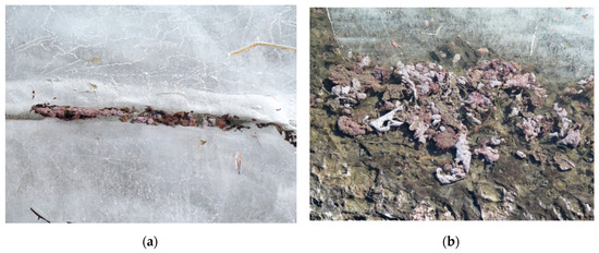 Photographs of Planktothrix clumps from Lake Steinsfjorden in the March 2015: (a) in a crack in the ice, and; (b) on the shoreline, illustrating the large quantities of Planktothrix biomass in the ecosystem.