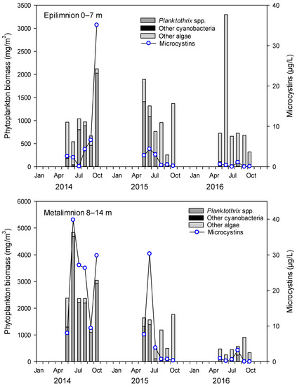 - Halstvedt, C.B.; Rohrlack, T.; Andersen, T.; Skulberg, O.; Edvardsen, B. Seasonal dynamics and depth distribution of Planktothrix spp. in Lake Steinsfjorden (Norway) related to environmental factors. J. Plankton Res. 2007, 29, 471–482. [Google Scholar] [CrossRef]