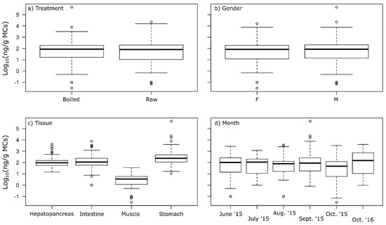 Boxplot of Log10 MC concentration (ng/g) by ELISA in noble crayfish A. astacus; (a) boiled (n = 50) versus raw (n = 50) for 2015; (b) gender, i.e., female (n = 42) or male (n = 58); (c) type of tissue, i.e., hepatopancreas, tail muscle, stomach, and intestine (n = 100) from 2015; (d) hepatopancreas, tail muscle, stomach, and intestine combined, by month from June to October 2015 and in October 2016 (n = 20 for each month, apart from n = 10 for Oct 2016). The thick lines are median values, the boxes indicate 25 and 75 quartiles of the data set, and the bars extend to min/max values of MC concentrations in the tissues. Observations shown as circles are regarded statistically as outliers.
