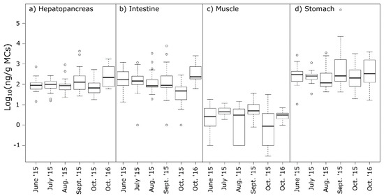 Boxplot of Log10 MC concentration (ng/g) by ELISA in the four tissues; (a) hepatopancreas; (b) intestine; (c) tail muscle; (d) stomach, for 110 noble crayfish (n = 20 for each month, except for Oct 2016 where n = 10). Dark lines are median values, the boxes indicate 25 and 75 quartiles of the data set, and the bars extend to min/max values of MC concentrations in the tissues. Observations shown as circles are regarded statistically as outliers, although here due to large individual variation.