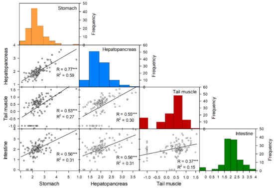 Correlation matrix showing pairwise correlations (Pearson’s rank) of Log10 MC concentration (ng/g) by ELISA in the four tissues hepatopancreas, tail muscle, stomach, and intestine from individual crayfish (n = 110). The lower left area shows bivariate scatterplots of individual samples with a fitted line, the coefficient of correlation R-values and the coefficient of determination R2-values and the significance level (asterisks). The asterisks (***) indicate significance level p < 0.001.