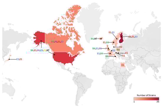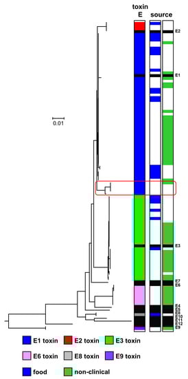 The upper lineage shown in Figure 5 includes the majority of strains with genes encoding type E neurotoxin—notably, strains with genes encoding botulinum neurotoxin subtypes E1, E2, E3, E6 and E8, and closely related strains lacking a neurotoxin gene. No strain possessed additional neurotoxin-encoding genes. This is consistent with previous studies [42,44,45,46]. It has been proposed that these strains and their type E neurotoxin genes arose from the insertion of the type E neurotoxin gene into genetically conserved bacteria, followed by recombination events [42]. Strains possessing a gene encoding subtype E1 neurotoxin appeared more diverse (based on core genome SNPs analysis), and were isolated over a longer period of time and wider geographical location (northern Europe, central Europe, north America, Africa, and Asia) than strains possessing genes encoding subtypes E2, E3 or E6 neurotoxin (Table S1), although it should be noted that more strains possessing a gene encoding subtype E1 neurotoxin were included in the present study. Strains throughout this lineage were associated with foodborne botulism or isolated from the environment (non-clinical isolates) or from an unknown source (Figure 5). Foodborne botulism was generally associated with the consumption of fish.