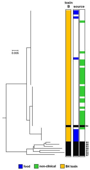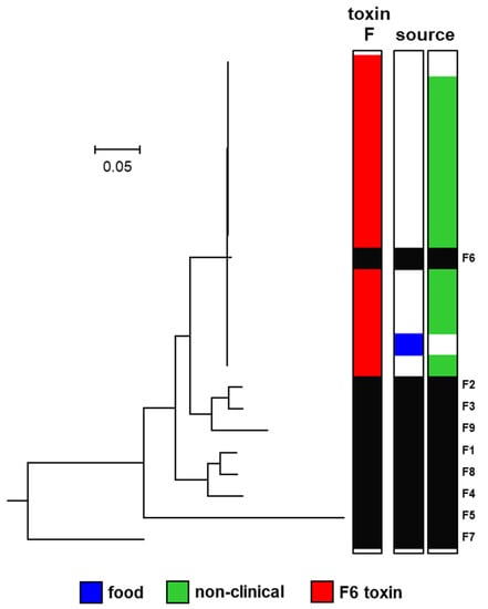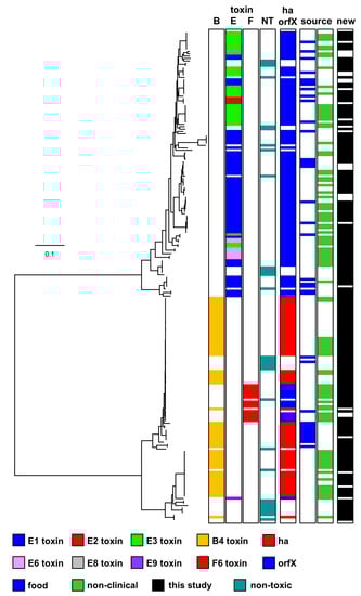 - Mazuet, C.; Legeay, C.; Sautereau, J.; Ma, L.; Bouchier, C.; Bouvet, P.; Popoff, M.R. Diversity of Group I and II Clostridium botulinum Strains from France Including Recently Identified Subtypes. Genome Biol. Evol. 2016, 8, 1643–1660. [Google Scholar] [CrossRef]