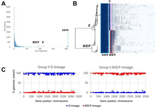 The subdivision of the C. botulinum Group II genomes into two distinct genomic lineages, one containing 113 genomes with different subtypes of the type E toxin gene (type E toxin gene lineage), and one containing 95 genomes primarily with subtype B4 toxin gene or subtype F6 toxin gene or more rarely type E toxin gene (type B/E/F toxin gene lineage) (Figure 5) was used to search for lineage-specific genes. The pangenome of C. botulinum Group II was generated using Prokka-annotated genome sequences and the Roary software package [67], followed by identification of lineage-specific genes defined as present in ≥90% of genomes of the lineage, and ≤10% of genomes in the other lineage. The C. botulinum Group II pan-genome contained a total of 16,571 annotated features (Figure 6A), with a core genome of 1768 features present in >99% of all genomes from both lineages. There were 390 features specific for the type E toxin gene lineage, and 409 features specific for the type B/E/F toxin gene lineage (Figure 6B). Two complete genomes were selected as representatives for each lineage, Alaska E43 for the type E toxin gene lineage, and Eklund 17B-NRP for the type B/E/F toxin gene lineage, and the relative position of genes specific for their lineage were plotted (Figure 6C). The lineage-specific genes were spread throughout the chromosome, without a clear hotspot for integration such as mobile elements, plasmids or phages. While a detailed investigation of the lineage-specific genes falls outside the scope of this study, we note that the type E toxin gene lineage contains a histidine biosynthetic pathway (hisSZGDCBHAFIEJ) absent from the type B/E/F toxin gene lineage, indicating that histidine metabolism or potential auxotrophy may be used to distinguish these two lineages. Conversely, no comparable features were identified in the type B/E/F toxin gene lineage, and hence this may require more in-depth investigation.