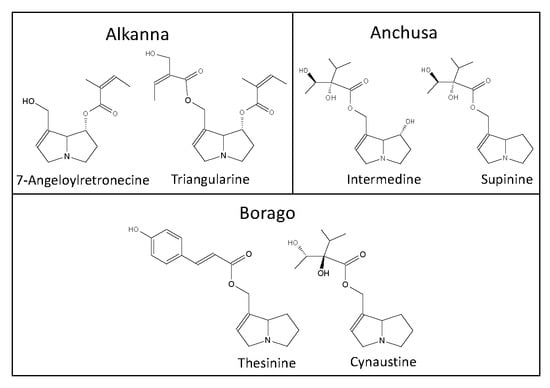 Pyrrolizidine alkaloids inherent in the genera of Alkanna, Anchusa, and Borago.