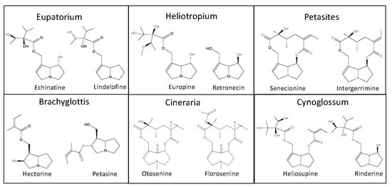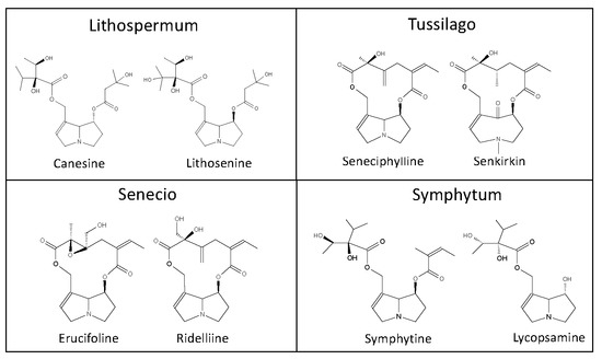 Examples for PAs inherent in plants of the genera Eupatorium, Heliotropium, Petasites, Brachyglottis, Cineraria, and Cynoglossum.
