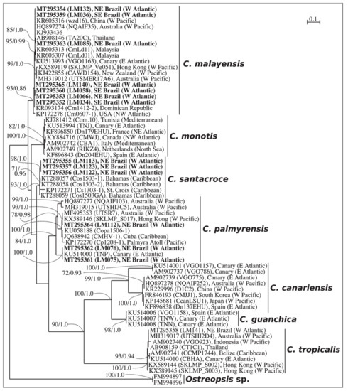 Phylogenetic analyses were performed with two reconstruction methods: maximum likelihood (ML) and Bayesian inference (BI). Considering that both ML and BI analyses gave the same tree topology and relationships among clades, only the majority-rule consensus tree of the ML analysis is shown herein. Six distinct clades were found in the phylogeny inferred from ITS sequences (C. malayensis, C. monotis, C. santacroce, C. palmyrensis, C. canariensis and C. tropicalis), and seven clades from LSU D1–D3 (same clades as those inferred from ITS plus Coolia guanchica) ( Figure 1 and Figure 2). The sequences from Brazil fit within four (C. malayensis, C. santacroce, C. palmyrensis and C. tropicalis) out of the seven described species containing molecular data.