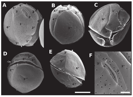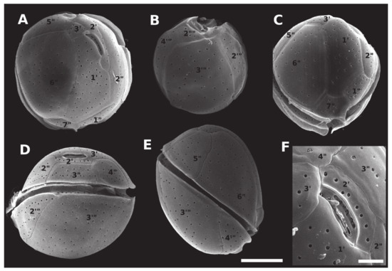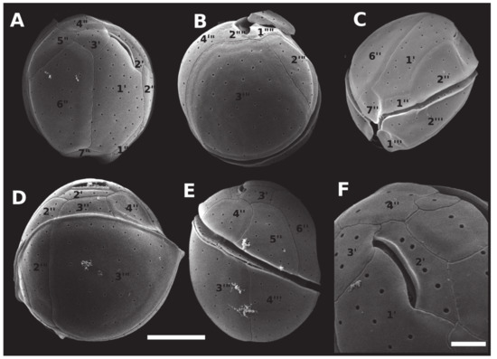 Scanning electron micrographs (SEM) of Coolia santacroce (strain LM-113) cells, showing: (A) apical view; (B) antapical view; (C) apical/ventral view; (D) dorsal view; (E) right side view; (F) apical pore complex. Scale bar = 10 µm, except in (F) (7.5 µm).