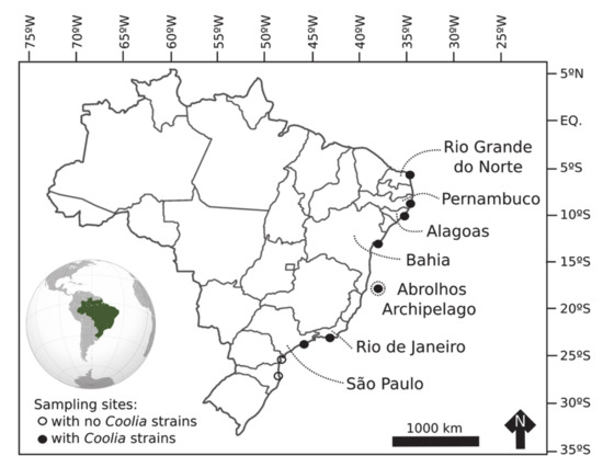 Sampling sites from the present study. Brazilian states and Abrolhos Archipelago (Bahia), where Coolia strains were established from, are indicated.