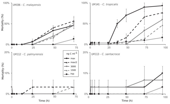 Lethality (%) of Coolia spp. to adults of Artemia salina over 96 h of exposure. Data series represent different biomass of the toxic algae, expressed as nanograms of carbon per mL. Maximum biomass (max) tested was 19,300 ng C mL−1 for C. malayensis, 16,000 ng C mL−1 for C. tropicalis, 15,000 ng C mL−1 for C. santacroce, and 11,500 ng C mL−1 for C. palmyrensis. Half of the maximum biomass was also tested (max/2), as well as three fixed biomasses: 3000, 1500 and 750 ng C mL−1.