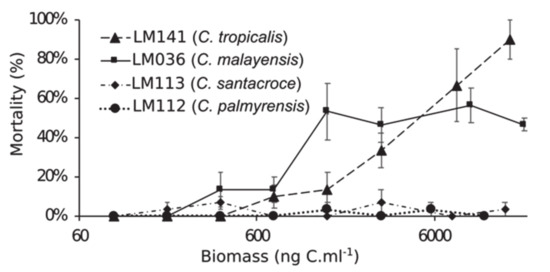 After the early study by Nakajima et al. [29], Holmes et al. [30] evaluated the toxicity of C. tropicalis (as C. monotis) using MBA. The authors reported mouse mortality caused by the butanol-soluble fraction of the extract, but no toxicity from either hexane- or water-soluble fractions. Later on, acetone and ethanol extracts from two different C. malayensis strains (CAWD77 and CAWD151) were also lethal to mice via MBA [31,39]. Moreover, C. malayensis (methanol extracts) exhibited the strongest cytotoxic effects to Rhabdomyosarcoma cells when compared to C. santacroce (intermediate toxicity) and C. palmyrensis (low toxicity) [19]. Finally, methanol extracts from Brazilian strains of both C. malayensis (UFBA044) and C. tropicalis (UFBA055) showed hemolytic activity to sheep erythrocytes [27]. These are the same species here reported as lethal to A. salina upon short-term (24–96 h) exposure to living cells. In our experiments, a northeastern Brazilian strain of C. tropicalis (LM141) was relatively more toxic than a C. malayensis strain isolated from the southeastern coast (LM036).